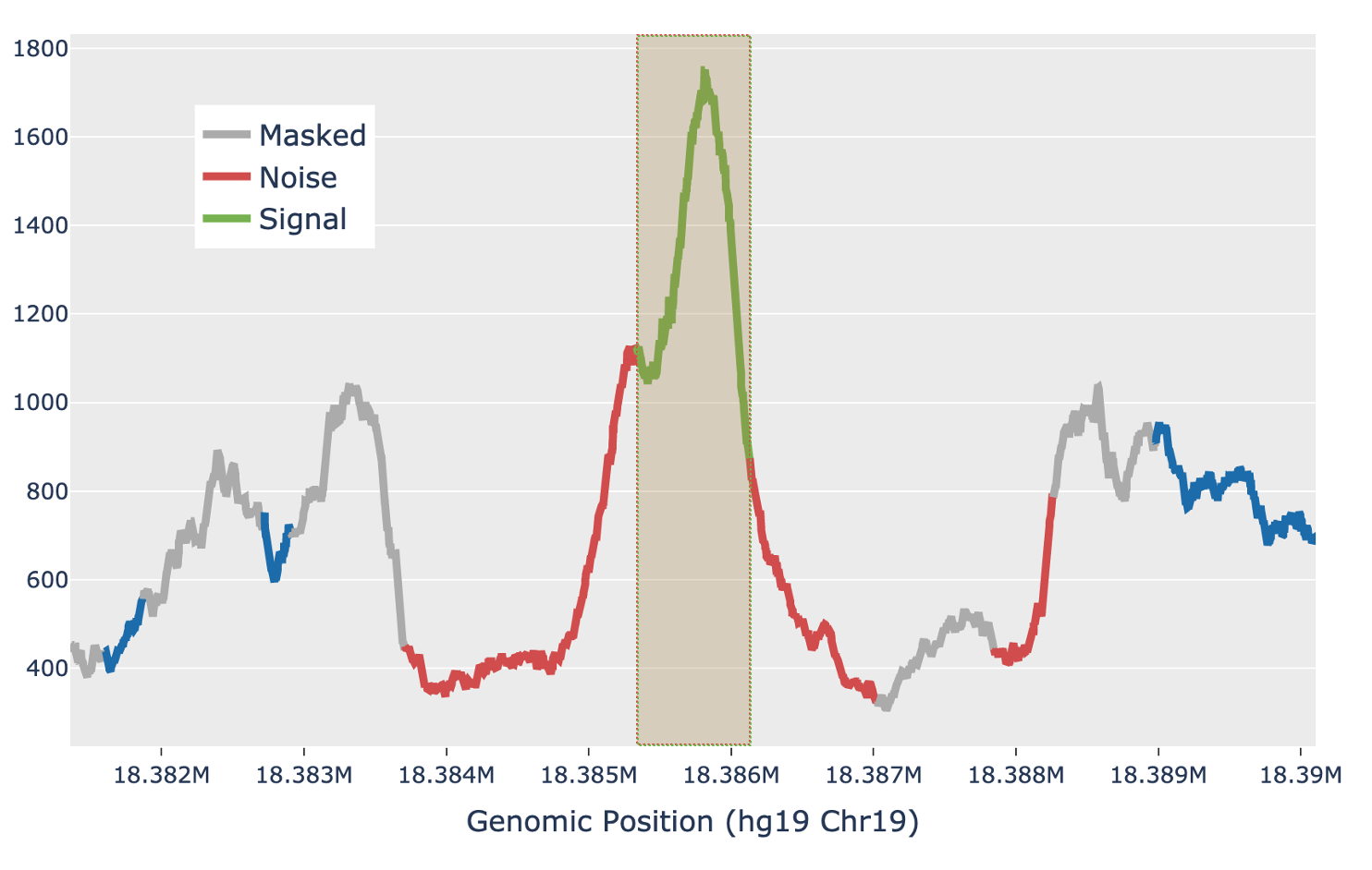 For each candidate region, the region is first padded by 5 Kb on either side to include local background context. The smoothed signal in the padded region is transformed with a 300bp Ricker wavelet transformation. Local maxima in the transformed signal are identified and putative peaks generated by extending the local maxima down to the total prominence of the maximum. Each putative peak is then filtered for local signal-to-noise ratio. The median signal inside the putative peak is used as the signal, while the noise is measured as the median signal in a fixed window outside of the peak, while also masking out any other putative peaks in the local region (figure below). Cell Ranger ATAC uses a Bayesian posterior probability estimate to exclude peaks that do not have a signal-to-noise ratio above 1.5 with at least 95% confidence. This Bayesian approach allows the use of a lower signal-to-noise threshold without overcalling peaks in very low depth regions.
