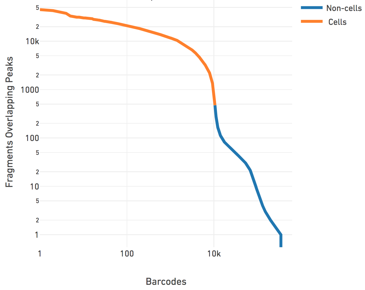 This step associates a subset of barcodes observed in the library to the cells loaded from the sample. Identification of these cell barcodes allows one to then analyze the variation in data at single cell resolution. For each barcode, we have the record of mapped high-quality fragments that passed all filters (the fragments.tsv file). Having determined peaks prior to this, Cell Ranger ATAC uses the number of fragments that overlap any peak regions, for each barcode, to separate the signal from noise. This works better in practice as compared to naively using the number of fragments per barcode. The cell calling is done in two steps. First Cell Ranger ATAC identifies barcodes that have fraction of fragments overlapping called peaks lower than the fraction of genome in peaks (for the sake of this calculation only, peaks are padded by 250 bp on both sides to account for fragment length). We have found that these barcodes typically have their cut sites randomly distributed over the genome, are not targeted to be enriched near functional regions, and do not exhibit the expected ATAC-seq "peaky" signal. Therefore Cell Ranger ATAC masks these low targeting barcodes out of the total set of barcodes observed for the library prior to cell calling.