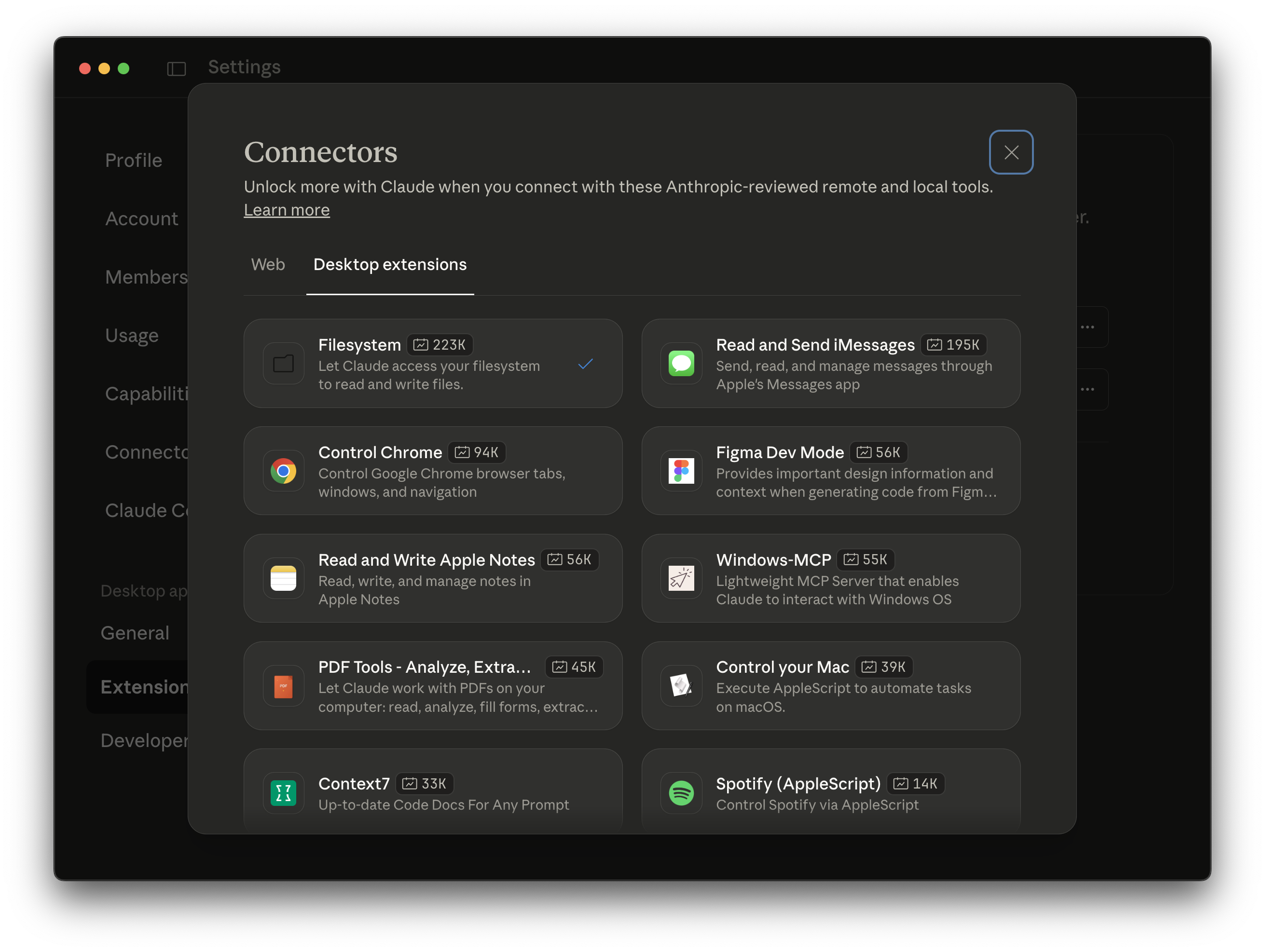 These are available in Settings > Extensions > Desktop extensions. Configure on install, or go to Settings > Extensions > Configure to toggle "Enabled" and set the allowed directories that the filesystem server can access.