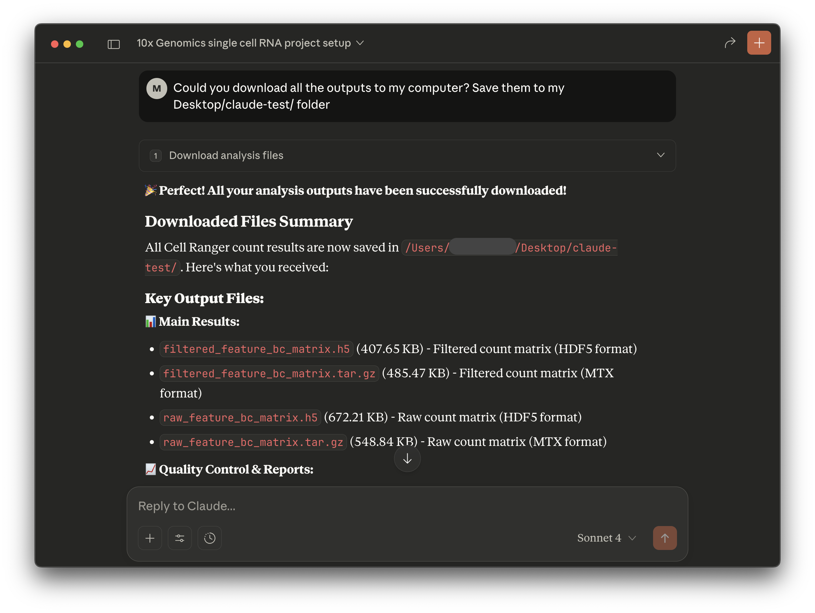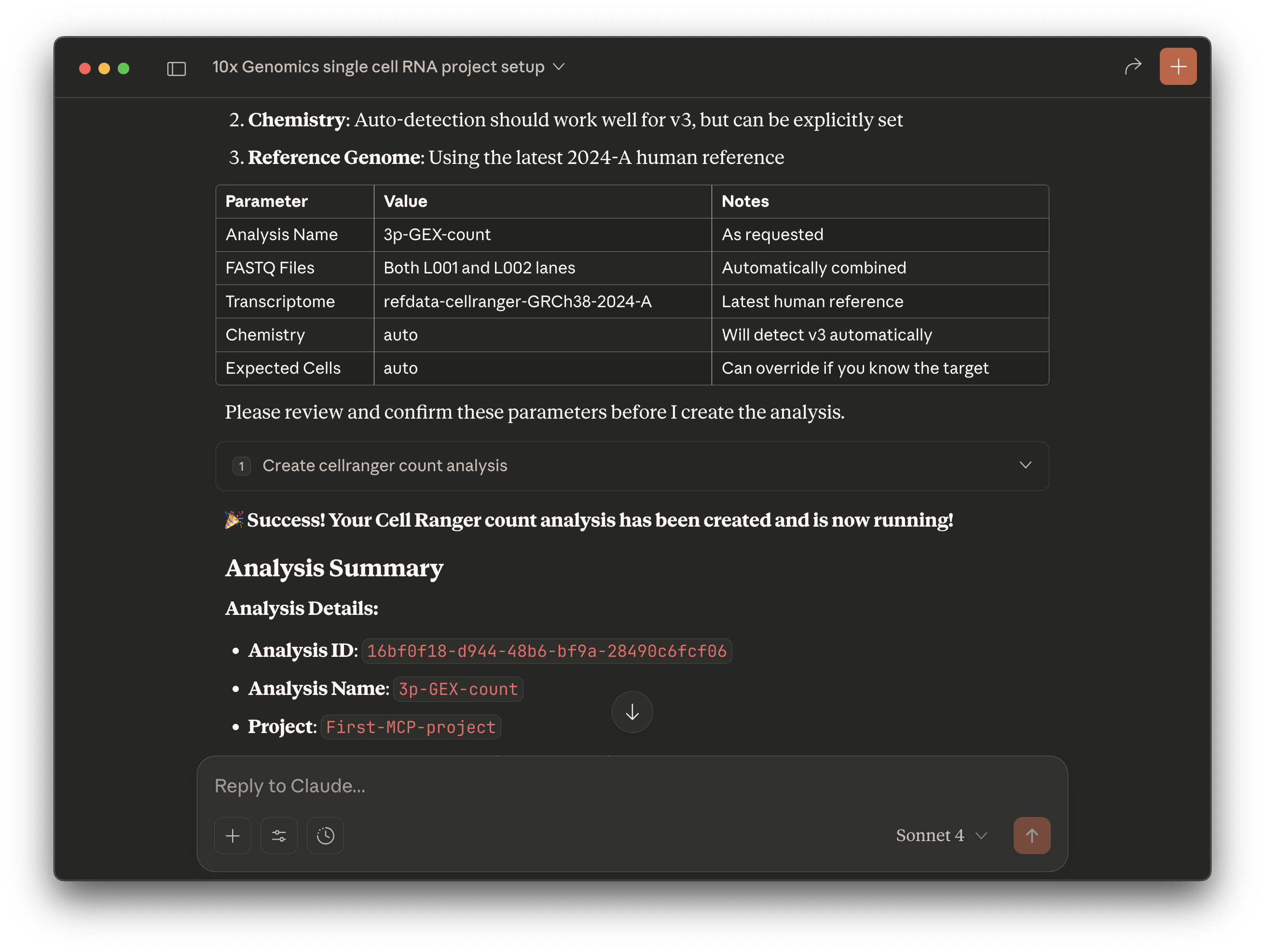 An example with a detailed prompt is shown below. The level of detail you provide is subjective, but more information may improve or speed up the analysis creation process. This particular example includes information provided with this 10x public dataset.