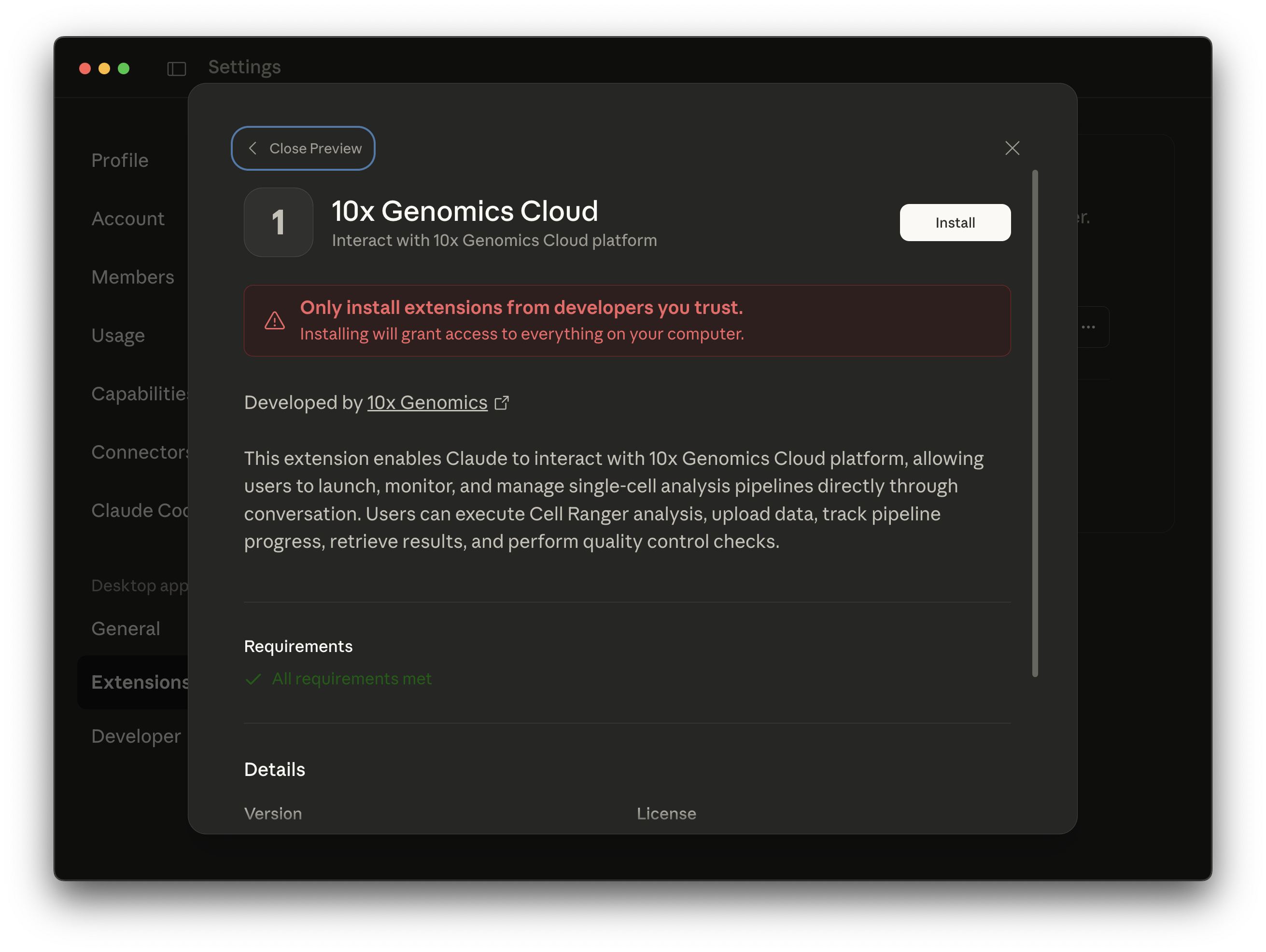 Beginning October 20, 2025, users can install the 10x Genomics Cloud prompt-based interface as an extension for Claude Desktop or a plugin for Claude Code from Anthropic.