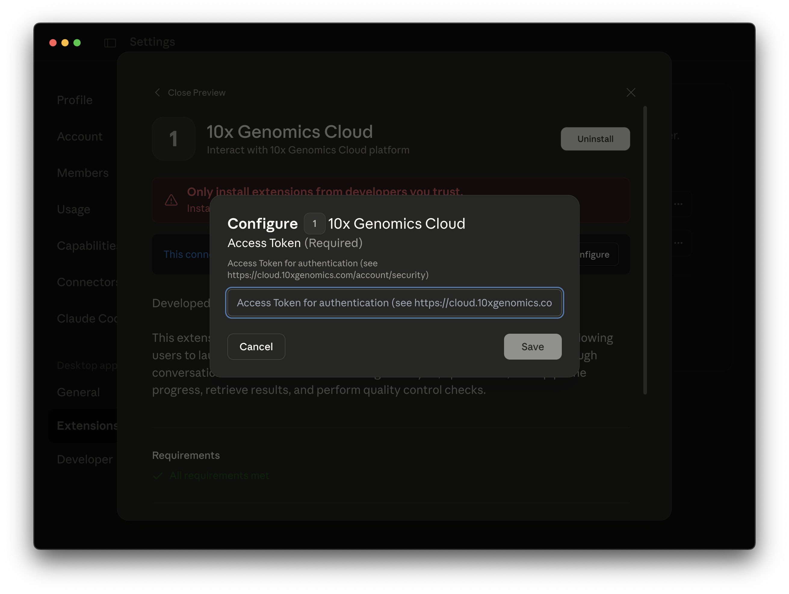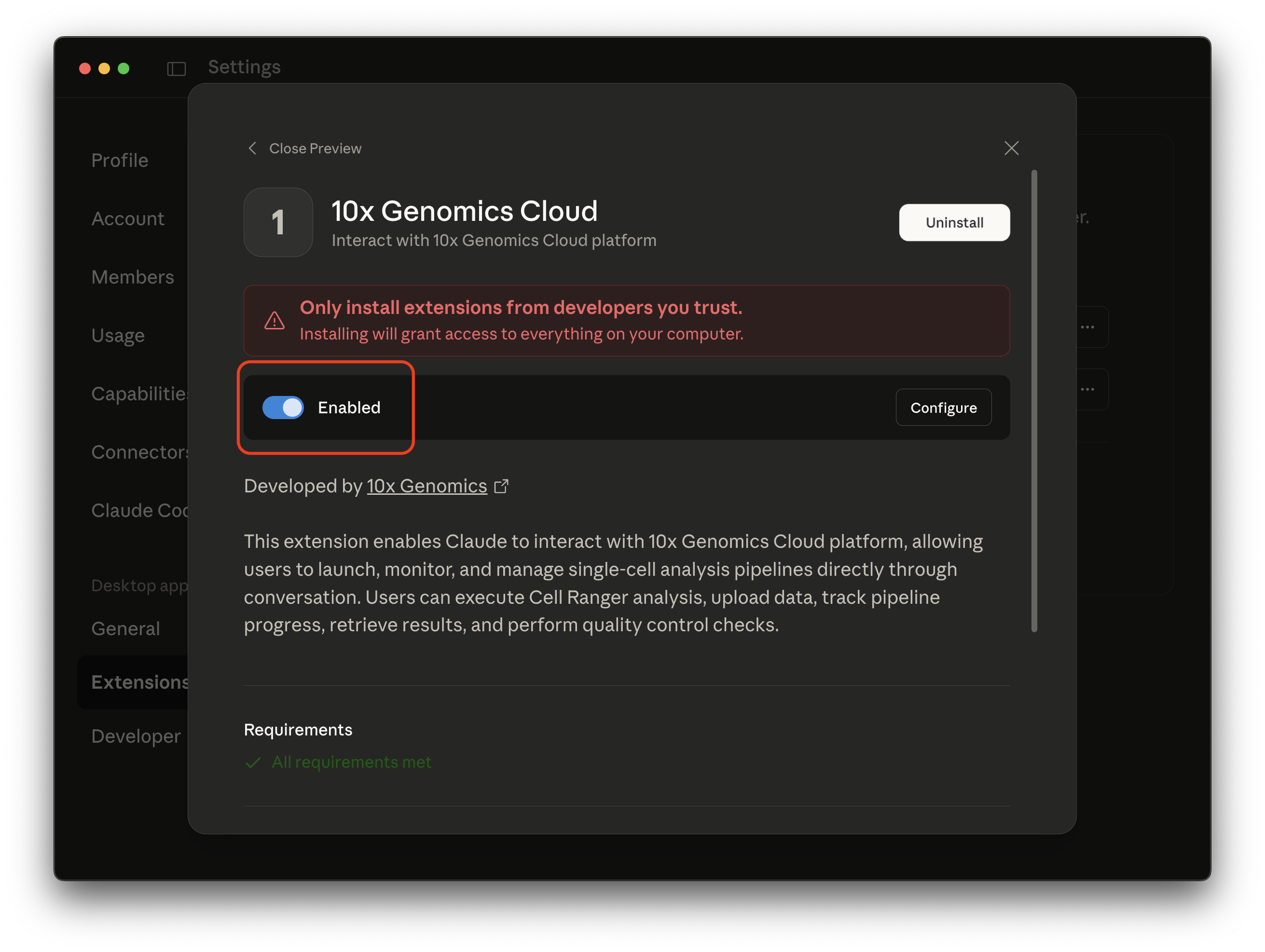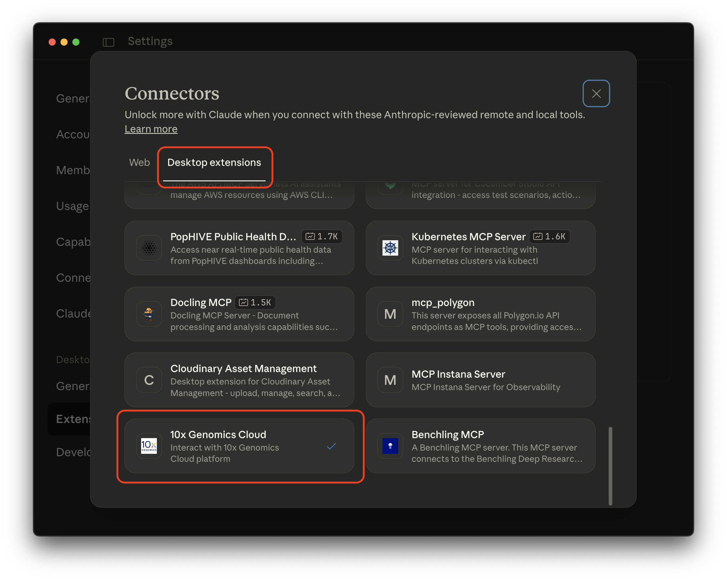 • Option 1: In Claude Desktop, go to Settings > Extensions > Browse extensions. Look for the 10x Genomics Cloud MCP extension.