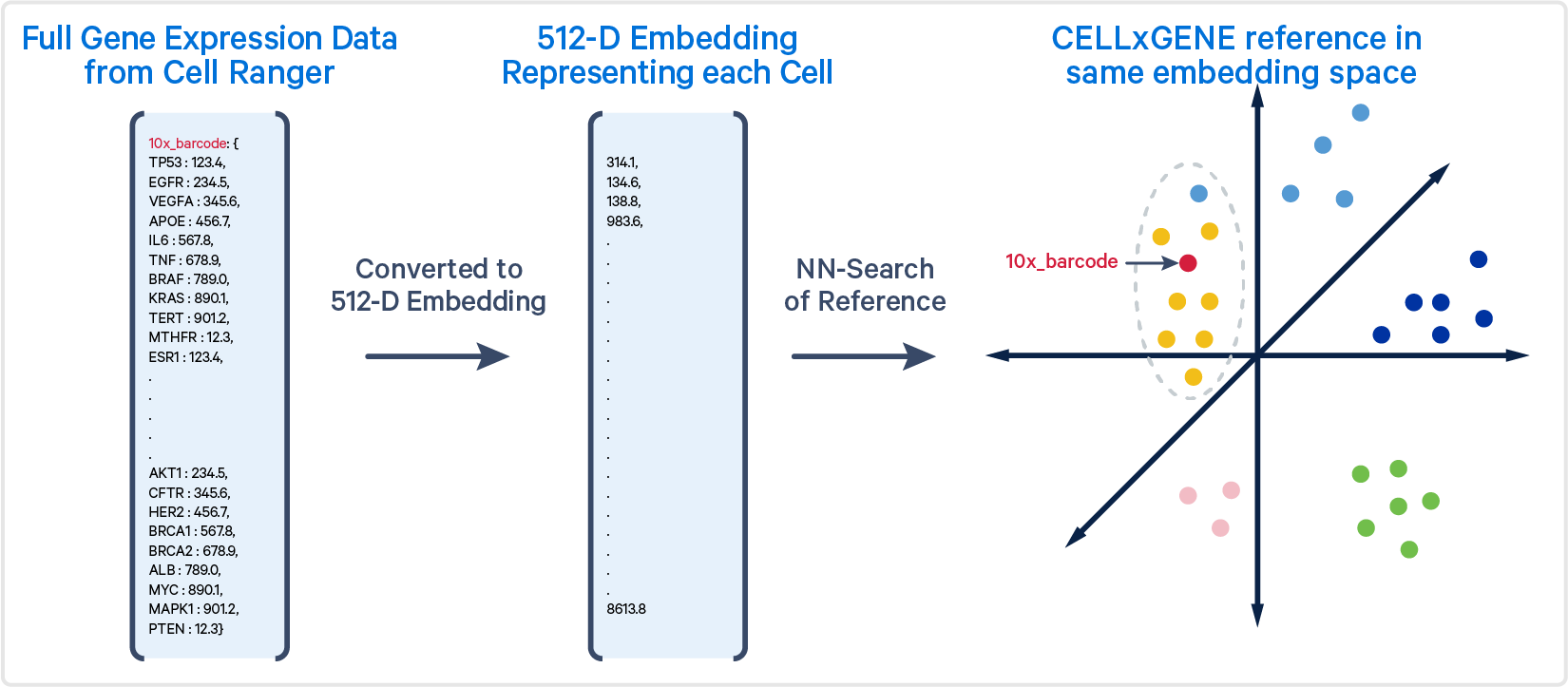 The algorithm generates an embedding for each cell barcode. The gene expression profile of each cell barcode being analyzed is projected into the same embedding. To classify a cell, the algorithm performs an approximate nearest-neighbor (ANN) search, identifying the 500 most similar cells in the reference set based on these embeddings. The most common cell type among these nearest neighbors is then assigned to the query cell. Models may differ in their inputs (e.g., all genes vs specific genes) and how they calculate embeddings. The models are described in more detail below.