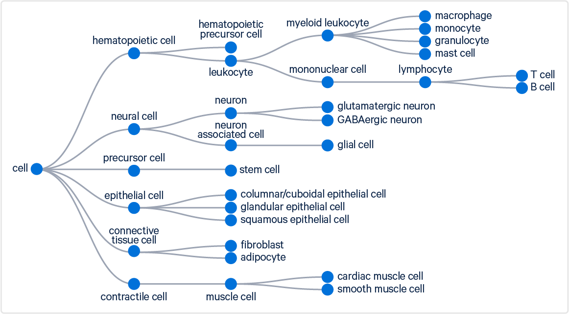 Our goal is to help users identify high-level cell types (e.g., T cells, B cells). To achieve this, the algorithm maps specific terms from the Cell Ontology to selected high-level cell types. These broader categories are displayed in both the web_summary.html and the .cloupe file. Some selected groups are illustrated in the figure below: