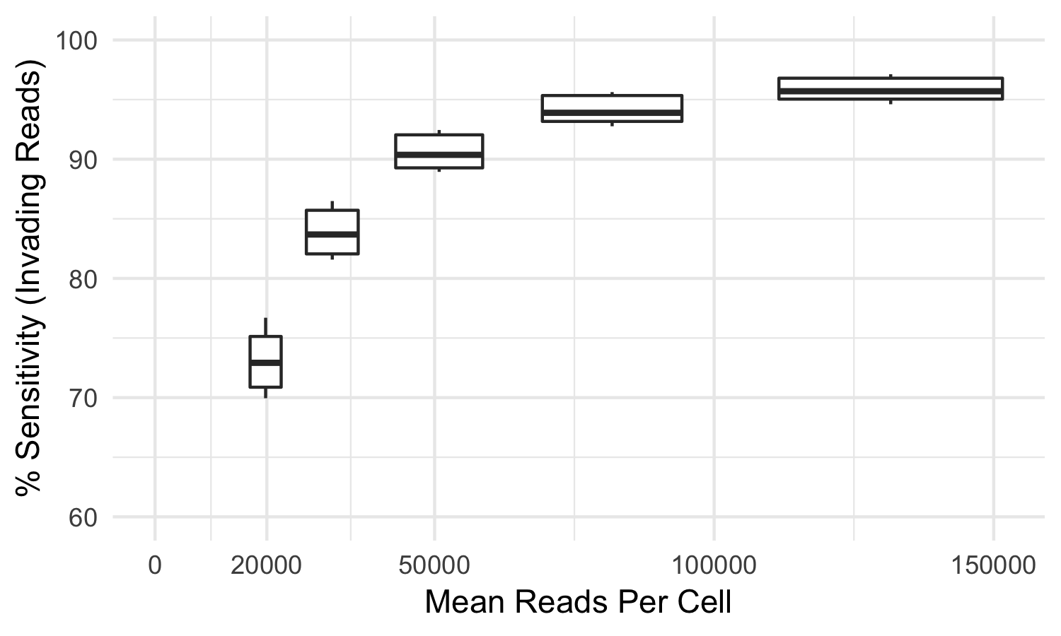 Some index-hopped library molecules are only observed in incorrect samples and thus cannot be detected as index-hopped. For this reason, the tool mitigates but cannot eliminate all index-hopped reads. In our testing, using samples sequenced to the recommended sequencing reads per cell, index-hopping-filter removes >70% of index-hopped reads compared to a dual-indexed ground truth. At lower sequencing depths, or if less than all samples from a flow cell are used, a smaller fraction of index-hopped reads will be detected. The following graph depicts the sensitivity (over a whole flow cell) of index-hopping-filter to reads from invading barcodes compared to a dual-indexed dataset as a function of sequencing depth.