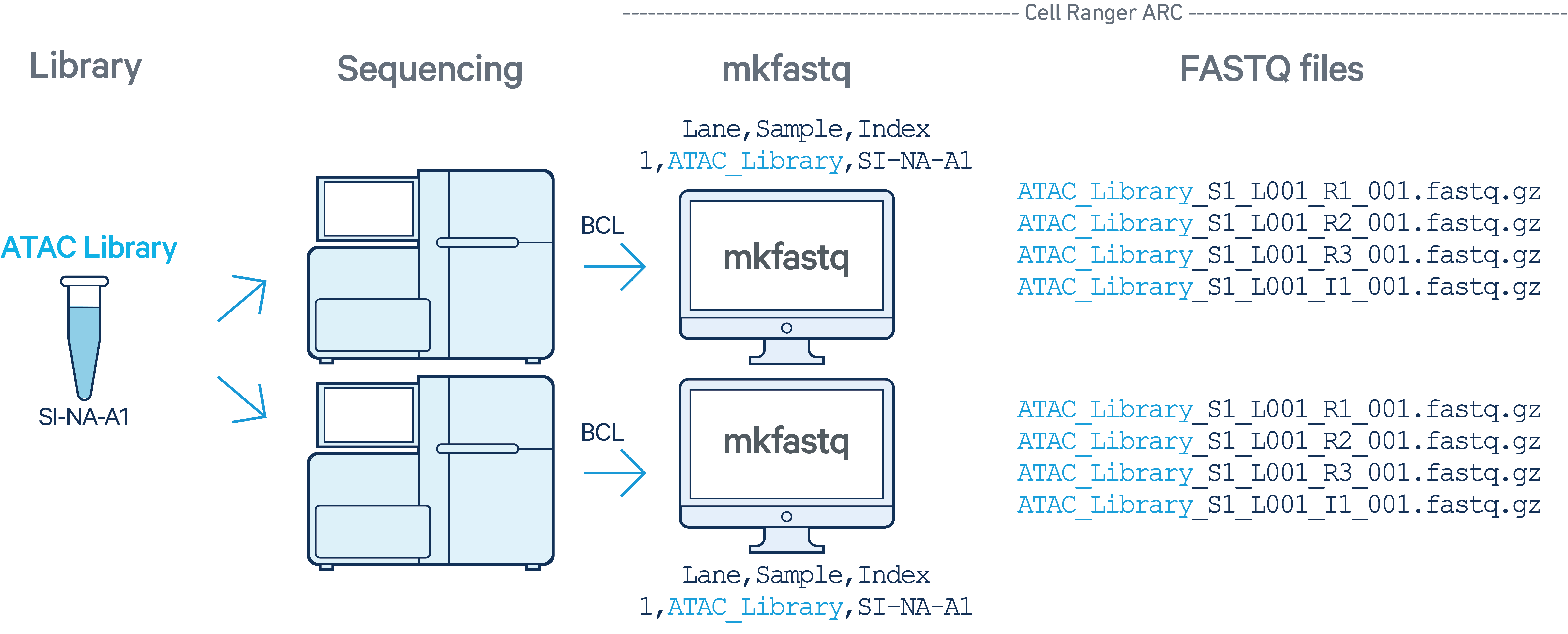 The cellranger-arc workflow starts by demultiplexing the Illumina sequencer's base call files (BCLs) for each flow cell directory (ATAC or Gene Expression) into FASTQ files. 10x Genomics has developed cellranger-arc mkfastq, a pipeline that wraps Illumina's bcl2fastq and provides a number of convenient features in addition to the features of bcl2fastq: