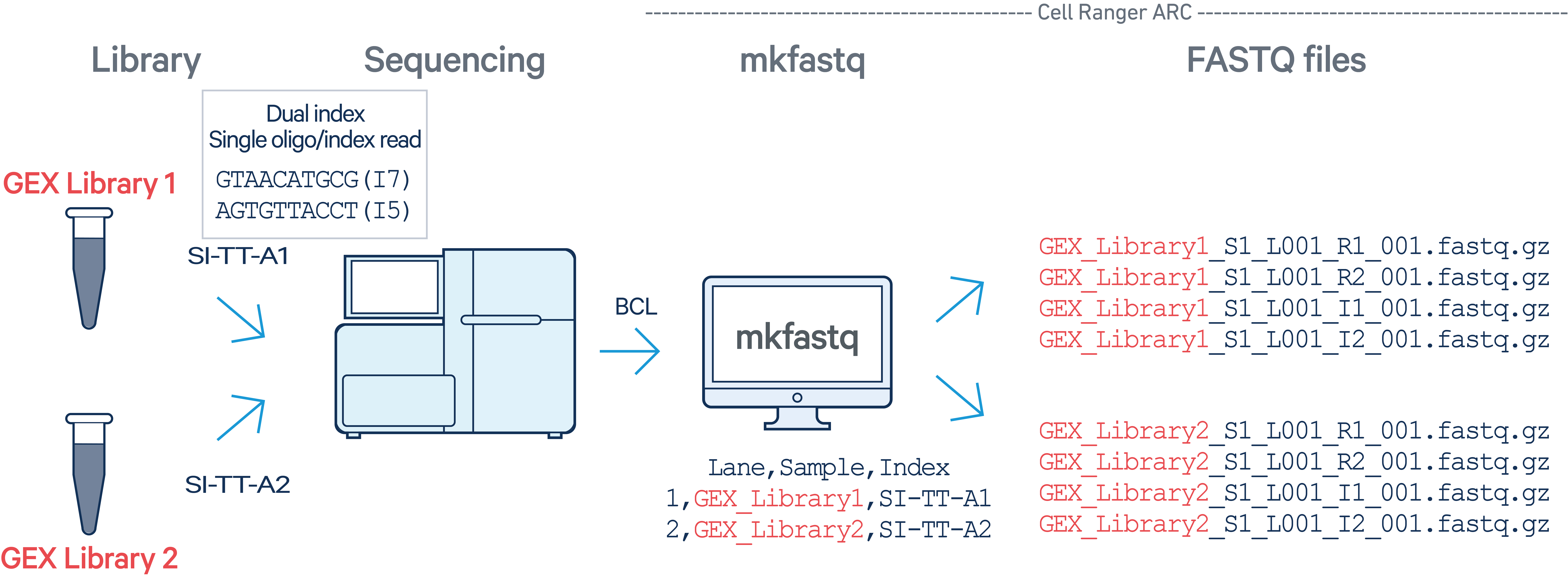 Version 1: "SI-TT-A1" refers to a 10x Genomics dual-indexed library sample index, so mkfastq auto-detects that this is a dual-index sample. In this example, only reads from lane 1 will be used. To demultiplex the given sample index across all lanes, omit the lanes column entirely.
