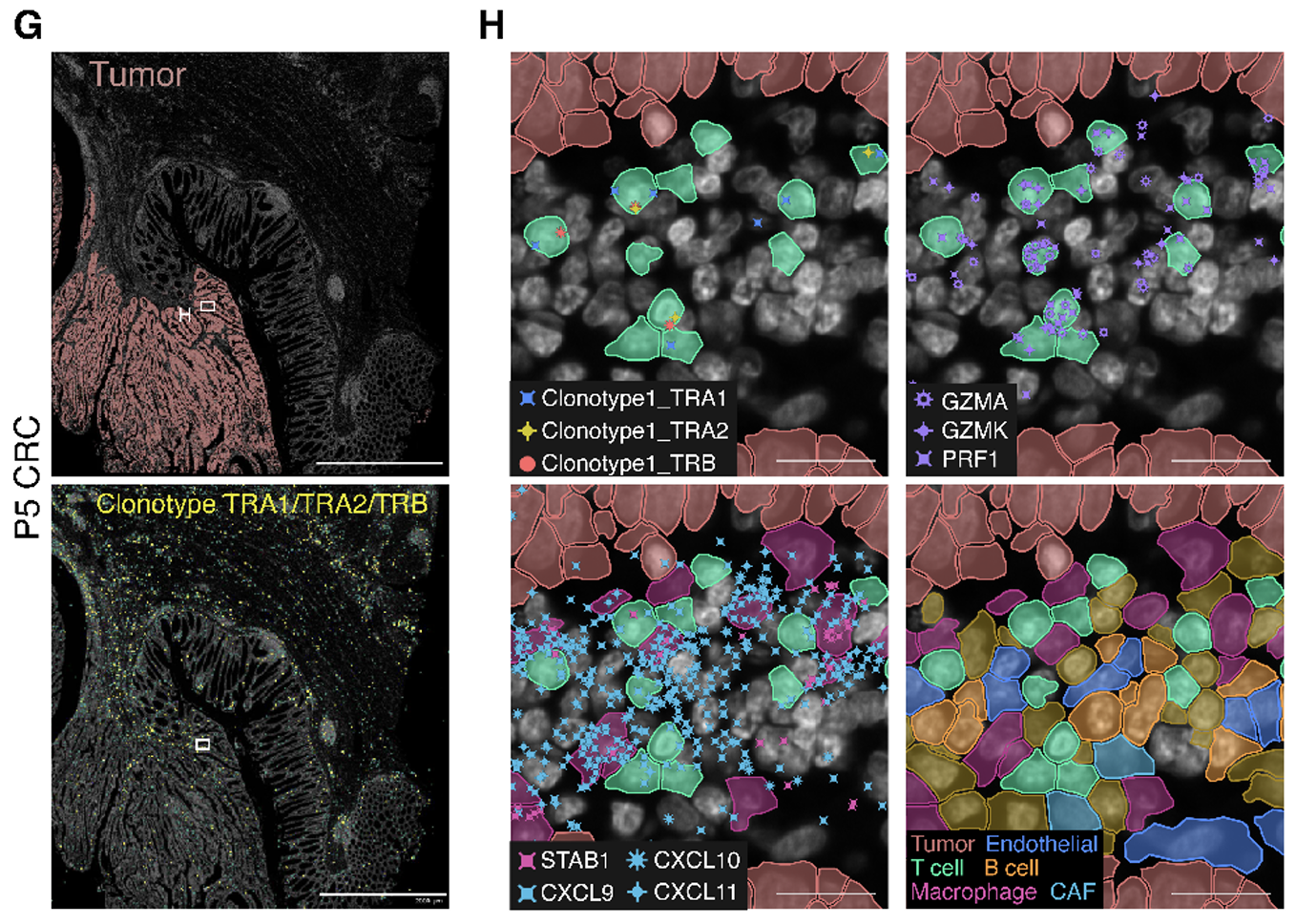 Combining this finding with the capabilities of Xenium, the team included probes targeting this clonotype’s TCR sequence in their 100-gene custom panel, which allowed them to localize the clonotype throughout the P5 CRC tumor section. They discovered clusters of these T cells close to tumor cells within gut-associated lymphoid tissues and confirmed by gene expression signatures that they were CD8+ cytotoxic T lymphocytes. Moreover, these T cells localized near CXCL9/CXCL10/CXCL11 chemokine foci, as well as STAB1+ macrophages*, B cells, and endothelial cells—cell groups which likely contributed to the expression of these chemokines that subsequently recruited immune cells to the tumor.