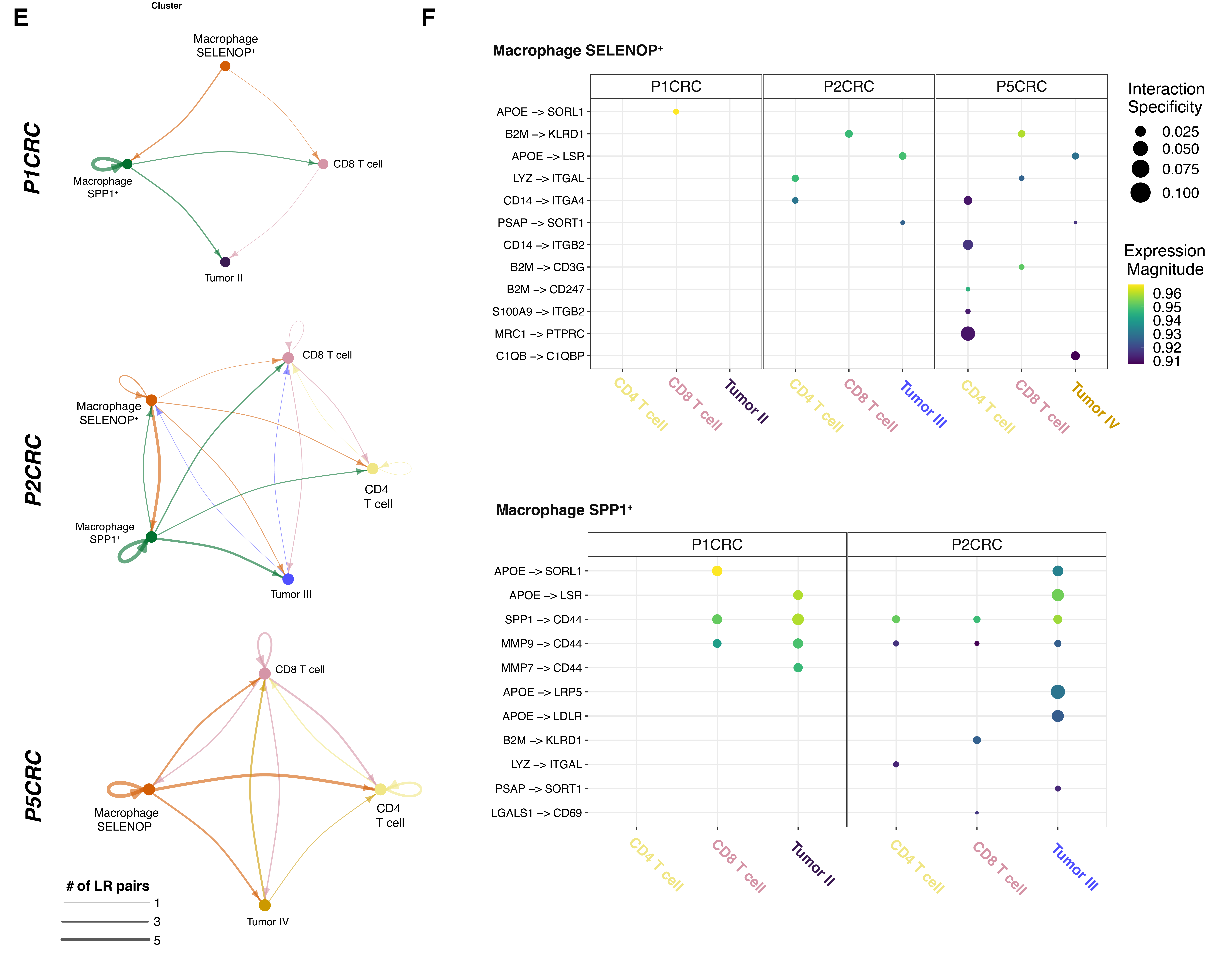 Both macrophage “neighborhoods” had seemingly pro-tumor gene expression signatures, in this case. Specifically, SELENOP+ macrophages appeared to co-localize with tumor cells that upregulated the REG family genes, which are typically associated with metastasis, advanced tumor stage, and poor prognosis in colorectal cancer. SPP1+ macrophages co-localized with tumor cells expressing TGFBI, also associated with poorer prognosis (1).