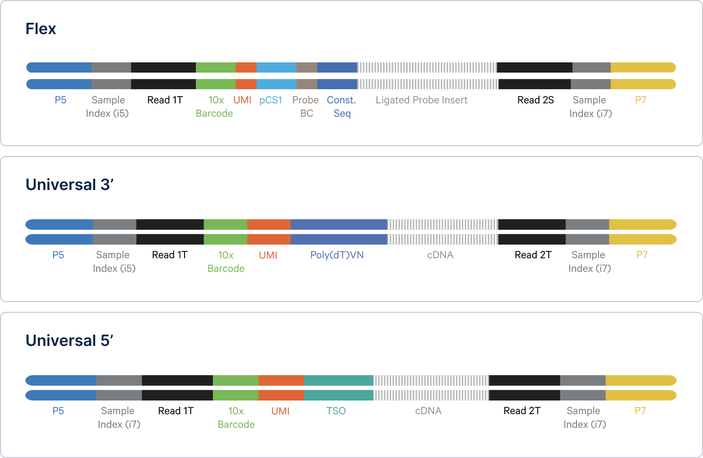 Within the sequences contained in the R1 files, the first ~16 bases correspond to the 10x Barcode (used to trace RNAs back to their cell of origin) and the following ~10–12 bases represent the unique molecular identifier (UMI; used for “counting” of transcripts to make sure the same RNA molecule is not counted multiple times). The subsequent bases correspond to the ligated probe insert (Flex assays) or complementary DNA (Universal assays).