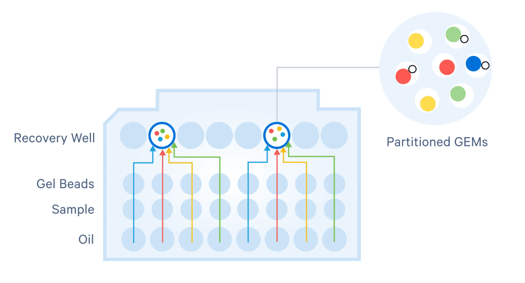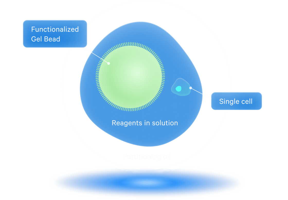 Within Chromium X series instruments, cells move through the channels at a limiting dilution, generating 10,000+ nanometer-sized Gel Beads-in-emulsion (GEMs) in 4 minutes. Each GEM is the site of a micro-reaction, in which Gel Beads are dissolved and target molecules from each cell are captured and barcoded, marking each target molecule's cell of origin.