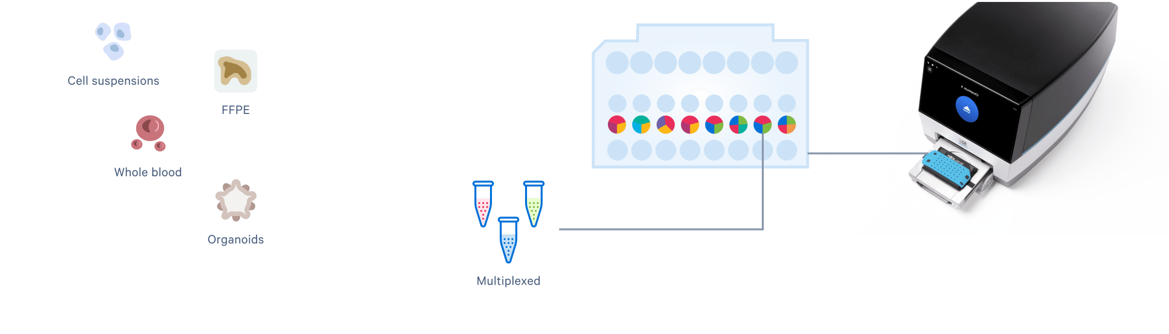 Process 1–8 samples and up to 40K cells/chip , with on-chip multiplexing for for any study, even at small scale