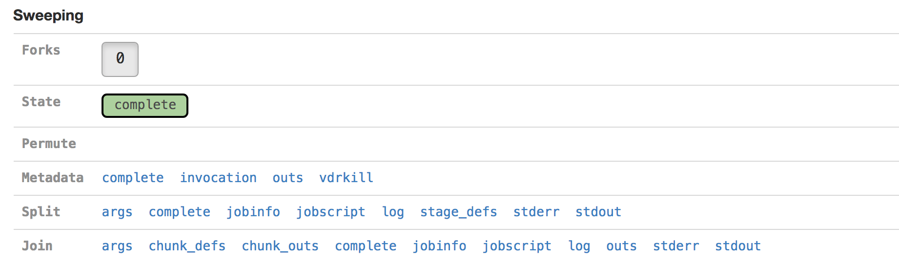 Clicking on an individual chunk exposes additional options for viewing metadata about that chunk's execution, including any errors, standard output, and in cluster mode the job script used to queue the job to the cluster. The jobinfo includes information about how a chunk was executed, selected environment variables, and for completed chunks various performance statistics such as peak memory usage and CPU time used. As with the Sweeping section, additional metadata associated with the chunk execution can also be viewed.