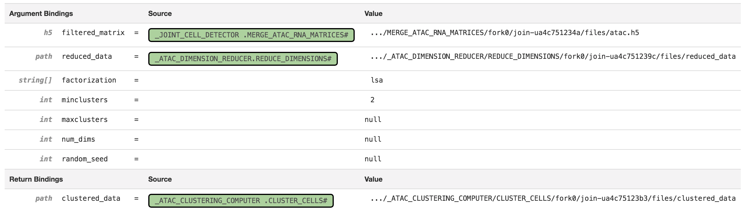 The Argument Bindings and Return Bindings sections display the inputs and outputs of the stage: