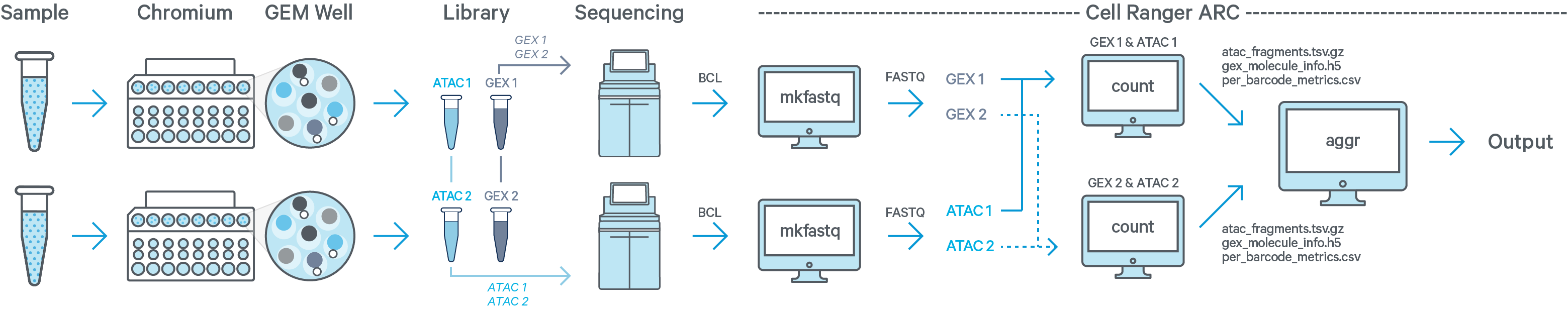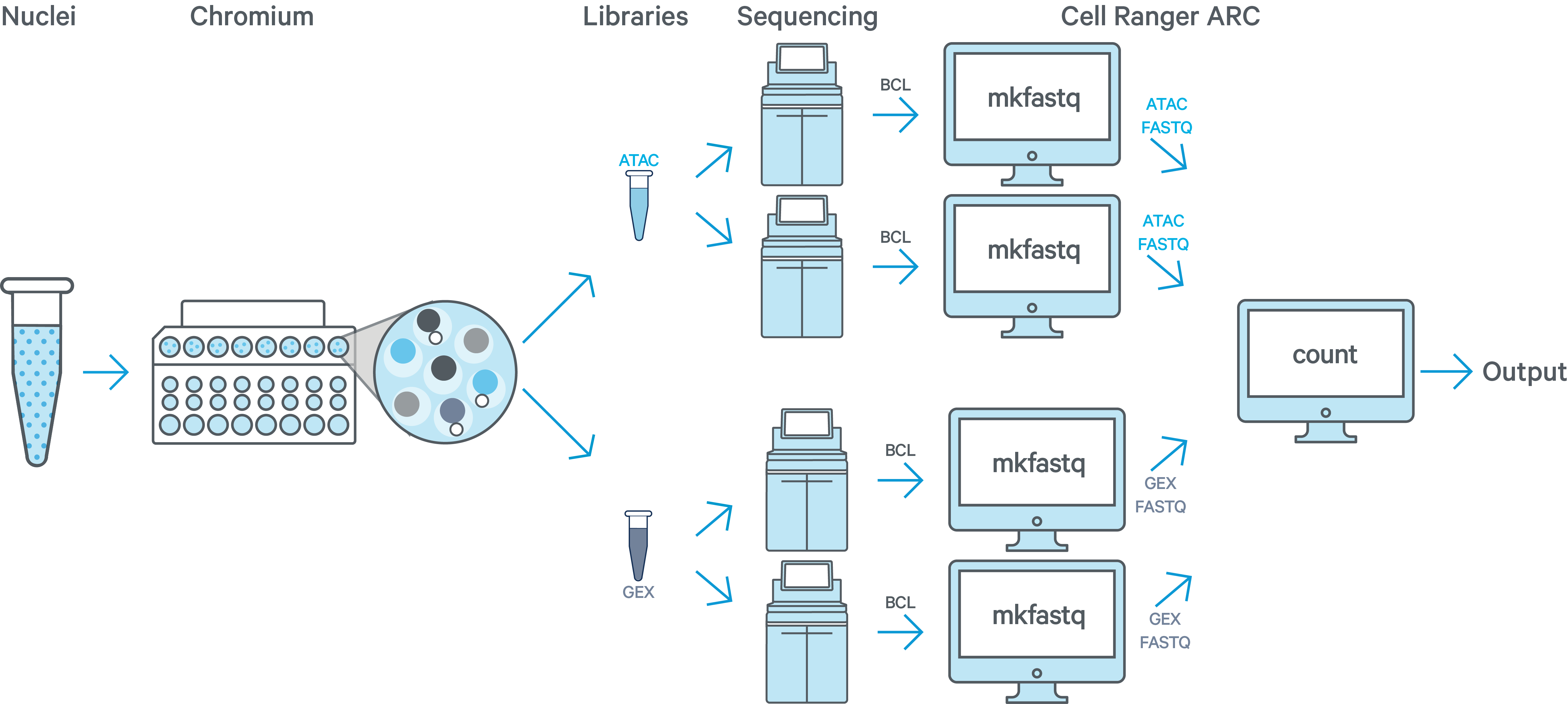 The Cell Ranger ARC workflow starts with demultiplexing the BCL files for each flow cell directory for all relevant ATAC and GEX sequencing runs. 10x Genomics recommends using cellranger-arc mkfastq as described in Generating FASTQs. If you are beginning with FASTQ files that have already been demultiplexed with bcl2fastq or BCL convert directly, or from a public source such as SRA, skip cellranger-arc mkfastq and begin with cellranger-arc count. The Specifying Input FASTQs page has specific guidelines on which arguments to use for your scenario.