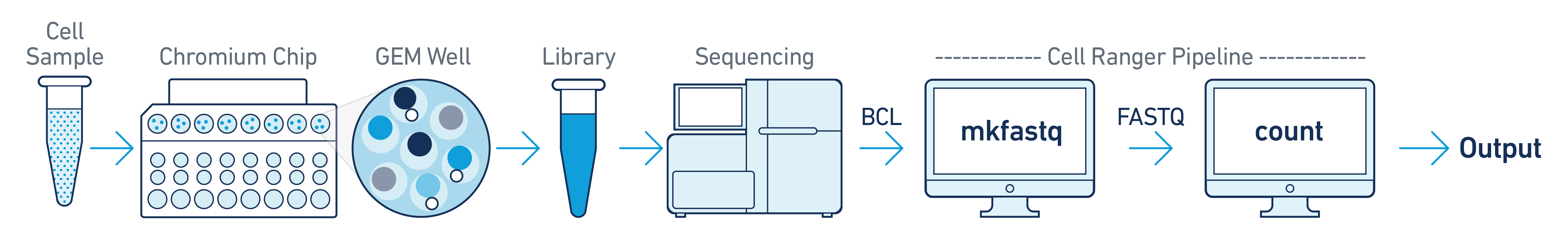 10x Genomics recommends using the pipeline analysis programs in order, starting with cellranger-atac mkfastq for demultiplexing the raw base call (BCL) files for each flow cell directory, and continuing with cellranger-atac count for single library analysis. If compatible FASTQ files are available from another source, a user can skip cellranger-atac mkfastq and use those FASTQ files as direct input to cellranger-atac count. Compatible FASTQ files can be found in reputable public datasets, or can be built by using Illumina software directly. See the Specifying Input FASTQs page for more details.