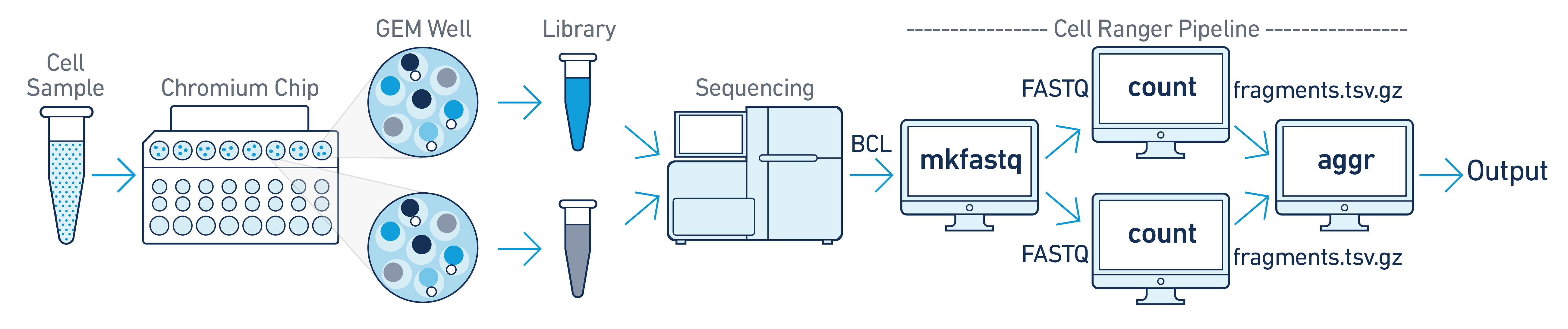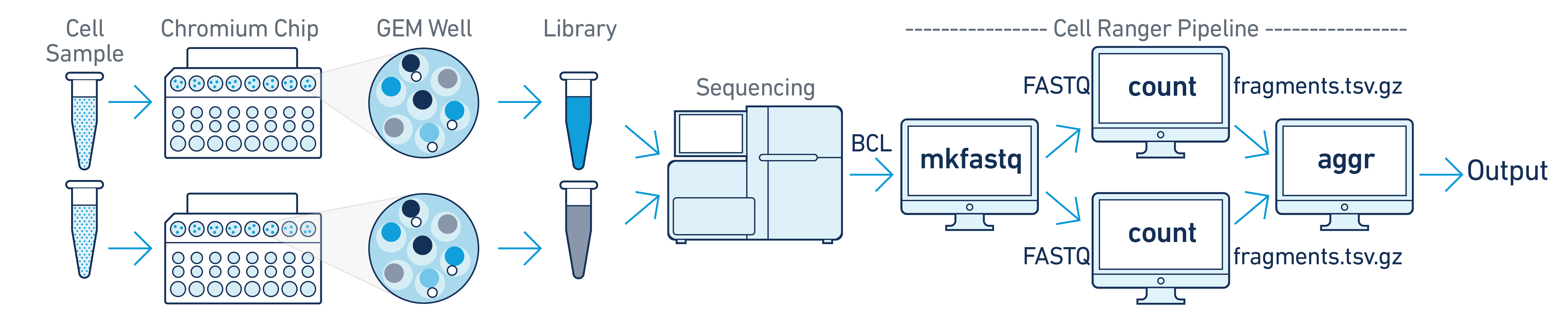 In this example, multiple samples are processed through multiple GEM wells to generate multiple libraries, which are then pooled onto one flow cell. After demultiplexing, run cellranger-atac count separately for each GEM well to get sample-specific data. For example, if your experimental design involves two samples, run cellranger-atac count twice. Then you can aggregate them with a single instance of cellranger-atac aggr, as described in Multi-Library Aggregation.