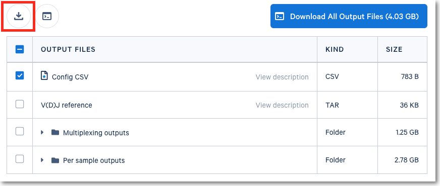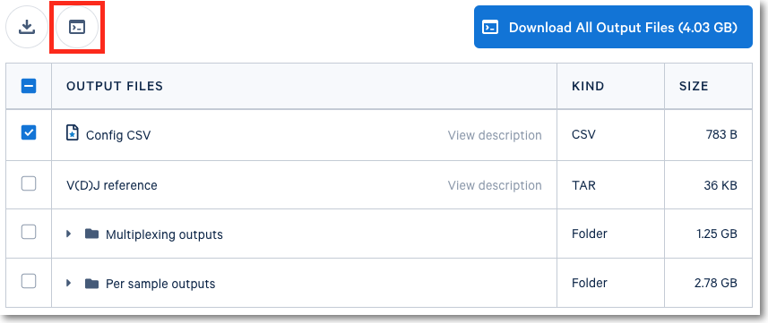 Any number of output files and entire output directories can be downloaded through the CLI options. After selecting one or more output files or folders, you can generate commands for your downloads using a CLI by clicking on the CLI Download button