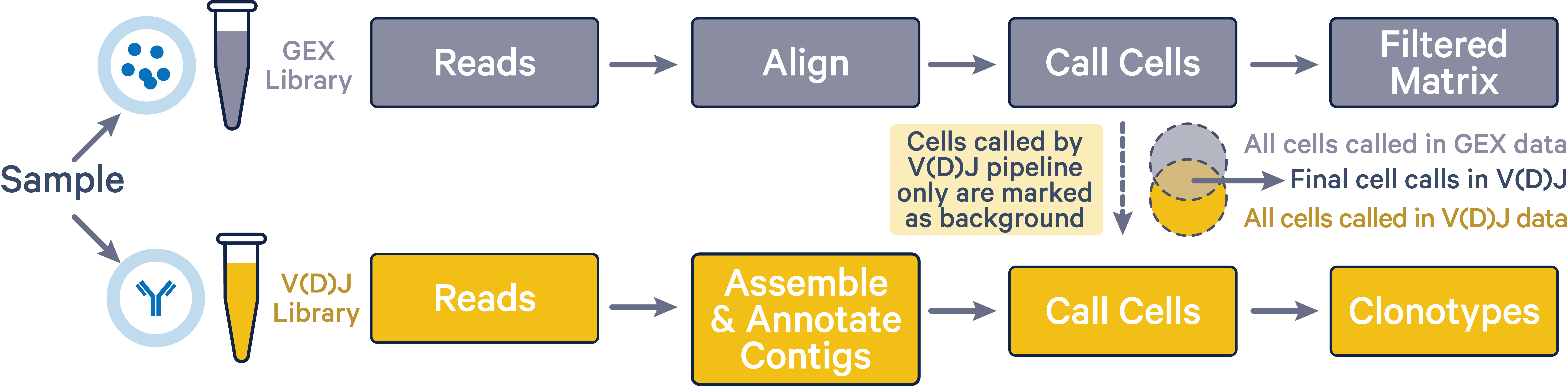 As shown in the image below, final V(D)J cell calls (intersection area) exclude cells that were only called by the vdj pipeline (yellow region).