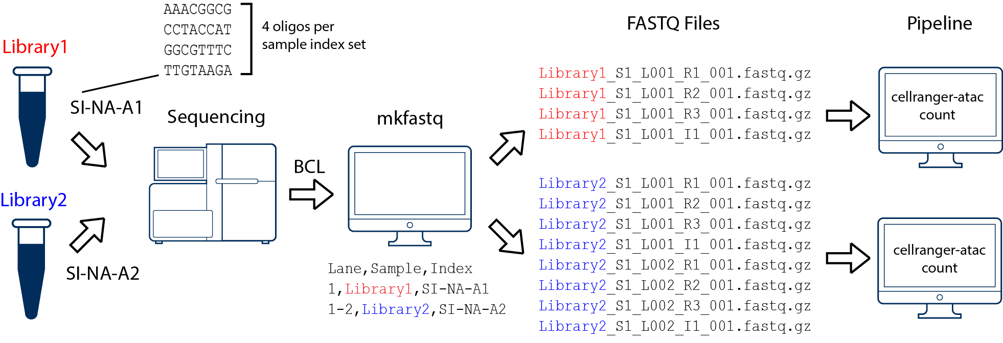 cellranger-atac mkfastqwill recognize the four oligos (AAACGGCG, CCTACCAT, GGCGTTTC, and TTGTAAGA) and merge the resulting FASTQ files. - Supports a simplified CSV sample sheet format to handle 10x Genomics use cases.