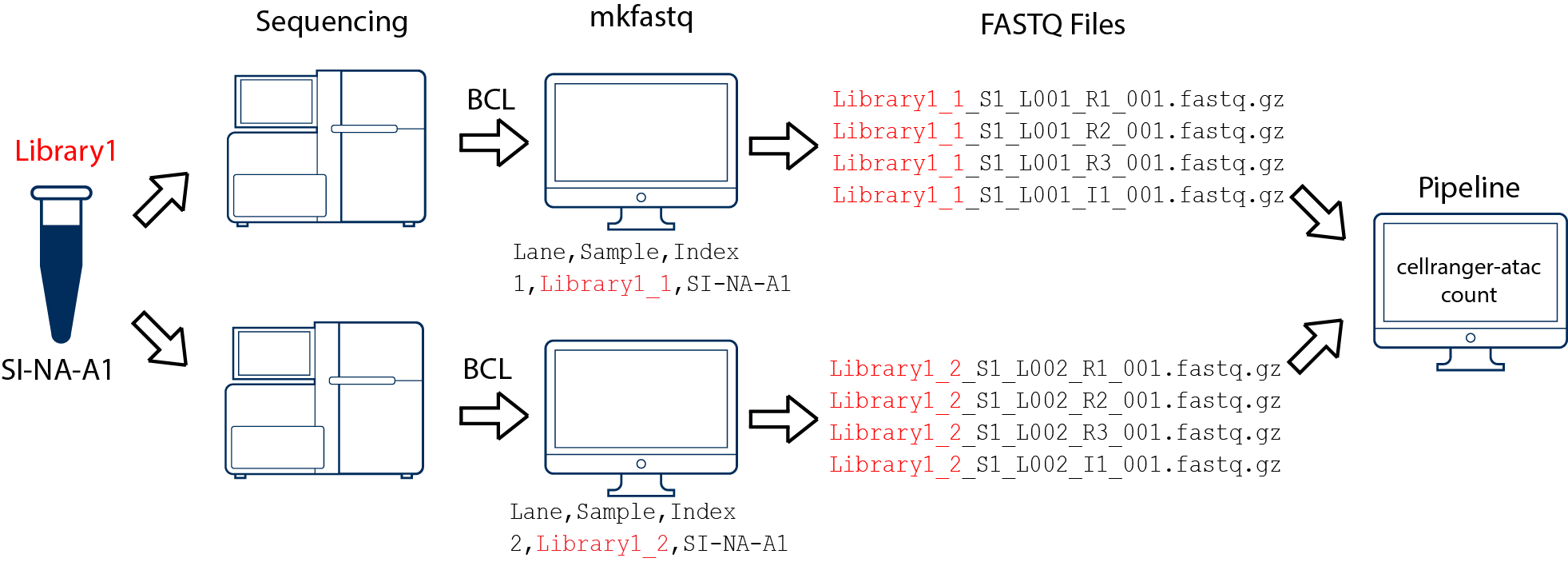 In the first example, two 10x Genomics libraries (each processed through a separate Chromium chip channel) are multiplexed on a single flow cell. After running cellranger-atac mkfastq, run a separate instance of the cellranger-atac count pipeline on each library: